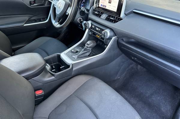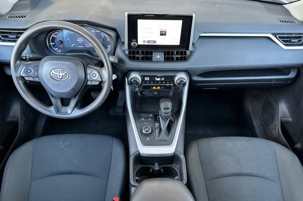 Backup Camera, Bluetooth, Alloy Wheels, Audio Package, Climate Package, Comfort Package, Light Package, NON SMOKER, Power Mirror Package, Power Package, Security Package, Sound Package, RAV4 Hybrid LE, 4D Sport Utility, 2.5L 4-Cylinder, eCVT, AWD, Ice Cap, Black w/Fabric Seat Trim, 4-Wheel Disc Brakes, 6 Speakers, ABS brakes, Air Conditioning, Alloy wheels, AM/FM radio: SiriusXM, Auto High-beam Headlights, Automatic temperature control, Brake assist, Bumpers: body-color, Driver door bin, Driver vanity mirror, Dual front impact airbags, Dual front side impact airbags, Electronic Stability Control, Emergency communication system: Safety Connect (1-year trial), Exterior Parking Camera Rear, Fabric Seat Trim, Four wheel independent suspension, Front anti-roll bar, Front Bucket Seats, Front Center Armrest, Front dual zone A/C, Front reading lights, Front Sport Seats, Illuminated entry, Knee airbag, Lane Departure Warning System, Low tire pressure warning, Occupant sensing airbag, Outside temperature display, Overhead airbag, Overhead console, Panic alarm, Passenger door bin, Passenger vanity mirror, Power door mirrors, Power steering, Power windows, Radio data system, Radio: AM/FM/XM Audio System, Rear anti-roll bar, Rear seat center armrest, Rear window defroster, Rear window wiper, Remote keyless entry, Speed control, Speed-sensing steering, Split folding rear seat, Spoiler, Steering wheel mounted audio controls, Telescoping steering wheel, Tilt steering wheel, Traction control, Trip computer. CARFAX One-Owner. Ice Cap 2023 Toyota RAV4 Hybrid LE AWD eCVT 2.5L 4-Cylinder