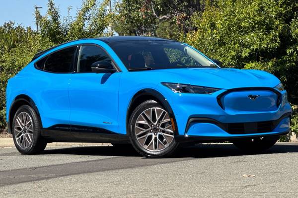 Backup Camera, Bluetooth, Alloy Wheels, Audio Package, Climate Package, Comfort Package, Heat Package, Leather Seats, NON SMOKER, One Owner Carfax, Power Mirror Package, Power Package, Security Package, Sound Package, Mustang Mach-E Premium, 4D Sport Utility, Electric Motor, Single-Speed Automatic, RWD, Grabber Blue Metallic, Black Onyx Premium Synthetic, 10 Speakers, 1st & 2nd Row Floor Liners w/o Carpet Mats, 4-Wheel Disc Brakes, ABS brakes, Air Conditioning, Alloy wheels, AM/FM radio: SiriusXM with 360L, AM/FM Stereo, Apple CarPlay/Android Auto, Auto High-beam Headlights, Auto-dimming Rear-View mirror, Automatic temperature control, Brake assist, Bumpers: body-color, Cargo Area Cover, Cargo Floor Liner, Compass, Delay-off headlights, Driver door bin, Driver vanity mirror, Dual front impact airbags, Dual front side impact airbags, Electronic Stability Control, Emergency communication system: 911 Assist, Equipment Group 300A, Exterior Parking Camera Rear, Four wheel independent suspension, Front anti-roll bar, Front Bucket Seats, Front Center Armrest, Front dual zone A/C, Front License Plate Bracket, Front reading lights, Fully automatic headlights, Garage door transmitter, Heated door mirrors, Heated front seats, Heated Perforated ActiveX Bucket Seats, Heated steering wheel, Illuminated entry, Interior Protection Package (Pre-Installed), Knee airbag, Low tire pressure warning, Memory seat, Mobile Power Cord (120V/240V), Navigation system: Connected Navigation, Occupant sensing airbag, Outside temperature display, Overhead airbag, Overhead console, Panic alarm, Panoramic Fixed-Glass Roof, Passenger door bin, Passenger vanity mirror, Power door mirrors, Power driver seat, Power Liftgate, Power passenger seat, Power steering, Power windows, Radio data system, Rain sensing wipers, Rear anti-roll bar, Rear seat center armrest, Rear side impact airbag, Rear window defroster, Rear window wiper, Remote keyless entry, Security system, SiriusXM Radio w/360L, Speed control, Speed-sensing steering, Speed-Sensitive Wipers, Split folding rear seat, Spoiler, Steering wheel mounted audio controls, SYNC 4A w/Enhanced Voice Recognition, Telescoping steering wheel, Tilt steering wheel, Traction control, Trip computer, Turn signal indicator mirrors, Variably intermittent wipers. CARFAX One-Owner. Grabber Blue Metallic 2024 Ford Mustang Mach-E Premium RWD Single-Speed Automatic Electric Motor