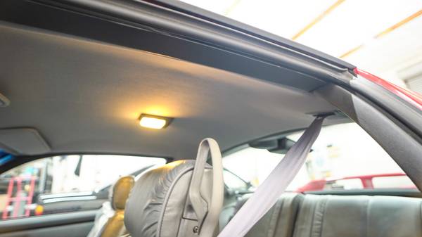 The cabin features front bucket seats and a contoured rear bench upholstered in gray leather. Appointments include cruise control, power door locks, and a cassette stereo. The headliner, sail panel, and sun visor upholstery were replaced in 2021, and the front passenger seatbelt guide was replaced in 2022.