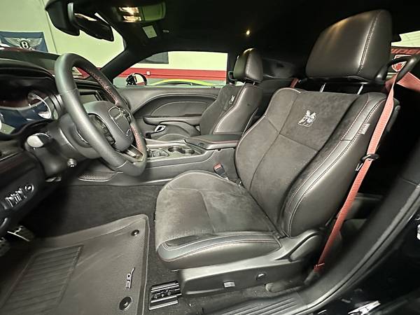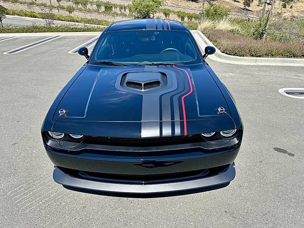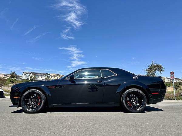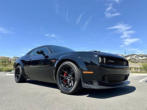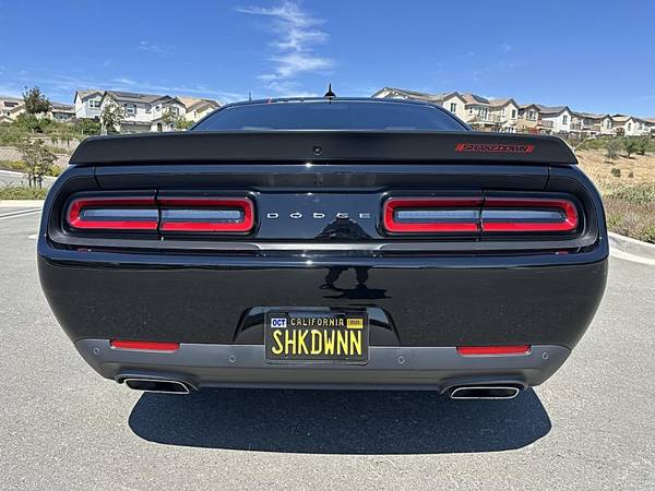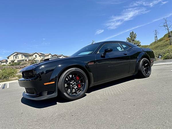 Star City Motors presents this nearly new 2023 Dodge Challenger R/T Scat Pack Widebody Shakedown Special Edition with only 1400 miles. This is one of approximately 500 Shakedown Special Edition Last Call examples produced for the US market. The car is finished in Pitch Black over black Nappa leather and Alcantara upholstery and is powered by a 6.4-liter Hemi V8 paired with a Tremec six-speed manual transmission. Equipment includes 20″ wheels, a Shaker hood and intake, a Widebody Competition suspension, Brembo brake calipers, HID headlights, heated and ventilated front seats, blind-spot monitoring, Alpine audio, and Uconnect touchscreen infotainment with navigation. The 6.4-liter Hemi V8 was factory rated at 485 horsepower and 475 lb-ft of torque. A Last Call plaque is affixed under the hood. Power is delivered to the rear wheels via a Tremec six-speed manual transmission. One owner California car, garage kept, zero accidents, Certified clean Carfax, still under factory warranty until Nov 2026 plus a powertrain warranty good until Nov 2028 or 60k miles. The car is finished in Pitch Black with stripes and a red Shakedown graphic on the rear spoiler. Additional details include a Mopar Shaker hood with pins as well as a front splitter, HID headlamps, widebody fenders, rain-sensing windshield wipers, rear parking sensors, and dual exhaust outlets. Original owner had Xpel paint protection film (PPF) on the entire front end of the car and a PRO ceramic coating was applied to the entire body when new. This is in brand new showroom condition!