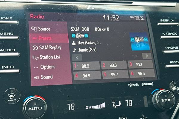 9 Speakers., AM/FM radio: SiriusXM., CD player., Radio data system., Radio: Entune 3.0 Audio Plus., Air Conditioning., Automatic temperature control., Front dual zone A/C., Rear window defroster., Heads-Up Display., Power driver seat., Power steering., Power windows., Remote keyless entry., Speed-sensing steering., Traction control., 4-Wheel Disc Brakes., ABS brakes., Dual front impact airbags., Front anti-roll bar., Knee airbag., Low tire pressure warning., Occupant sensing airbag., Overhead airbag., Rear anti-roll bar., Rear side impact airbag., Power moonroof., Brake assist., Electronic Stability Control., Exterior Parking Camera Rear., Auto High-beam Headlights., Delay-off headlights., Fully automatic headlights., Panic alarm., Security system., Speed control., Bumpers: body-color., Heated door mirrors., Power door mirrors., Turn signal indicator mirrors., Auto-dimming Rear-View mirror., Compass., Driver door bin., Driver vanity mirror., Front reading lights., Illuminated entry., Leather Shift Knob., Outside temperature display., Overhead console., Passenger vanity mirror., Rear reading lights., Rear seat center armrest., Tachometer., Telescoping steering wheel., Tilt steering wheel., Trip computer., Front Bucket Seats., Front Center Armrest., Heated front seats., Power passenger seat., Split folding rear seat., Passenger door bin., Alloy wheels., Variably intermittent wipers., Dynamic Radar Cruise Control., Traction Control., ABS., EBD., 9 Spkrs., Bluetooth., USB., AUX.,