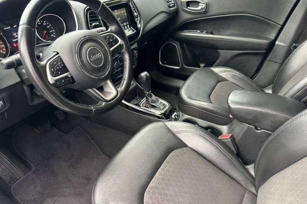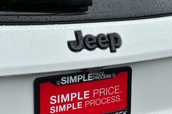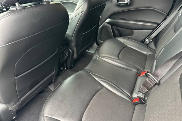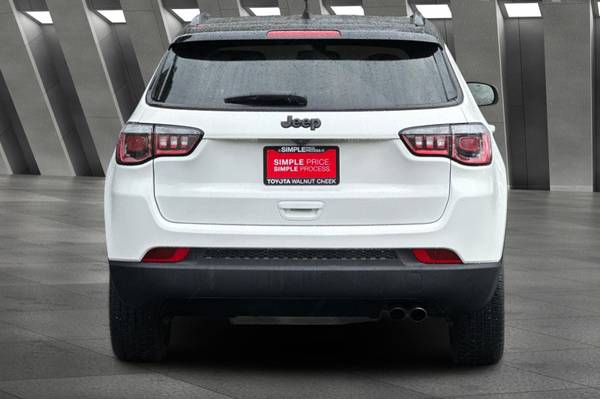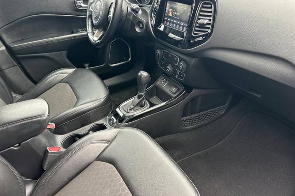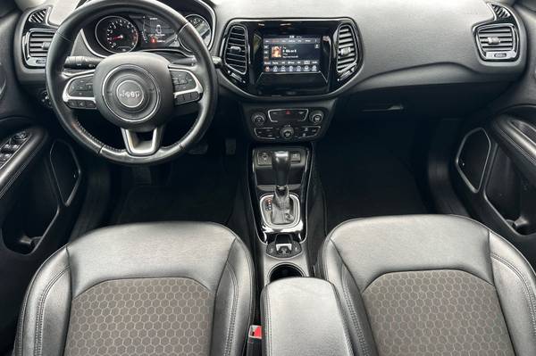 Black Roof., 6 Speakers., AM/FM radio: SiriusXM., Bluetooth® Streaming Audio., GPS Antenna Input., Media Hub (USB., AUX)., Premium Alpine Speaker System., Air Conditioning., Automatic temperature control., Front dual zone A/C., Rear window defroster., Power steering., Power windows., Remote keyless entry., Traction control., 4-Wheel Disc Brakes., ABS brakes., Dual front impact airbags., Front anti-roll bar., Knee airbag., Low tire pressure warning., Occupant sensing airbag., Overhead airbag., Rear anti-roll bar., Gloss Black Fog Lamp Bezels., Brake assist., Electronic Stability Control., ParkView Rear Back-Up Camera., Delay-off headlights., Front fog lights., Fully automatic headlights., Panic alarm., Speed control., Black Grille w/Black Rings., Bright Exhaust Tip., Bumpers: body-color., Gloss Black Compass Badge., Gloss Black Jeep Badge., Heated door mirrors., Power door mirrors., Roof rack: rails only., Spoiler., Apple CarPlay., Apple CarPlay/Android Auto., Compass., Driver door bin., Driver vanity mirror., Front reading lights., Google Android Auto., Illuminated entry., Leather Shift Knob., Outside temperature display., Overhead console., Passenger vanity mirror., Piano Black Interior Accents., Rear seat center armrest., Tachometer., Telescoping steering wheel., Tilt steering wheel., Trip computer., USB Host Flip., Front Bucket Seats., Split folding rear seat., Passenger door bin., Alloy wheels., Rear window wiper., Variably intermittent wipers., 3.502 Axle Ratio.,