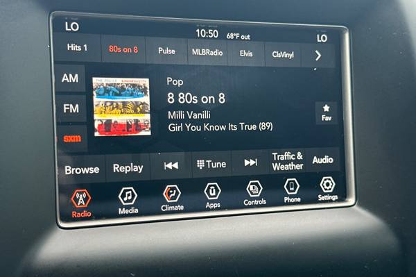 Premium Lighting Group., 6 Speakers., AM/FM radio: SiriusXM., GPS Antenna Input., Radio data system., Air Conditioning., Automatic temperature control., Front dual zone A/C., Rear window defroster., Power driver seat., Power steering., Power windows., Remote keyless entry., Normal Duty Suspension., Speed-sensing steering., Traction control., 4-Wheel Disc Brakes., ABS brakes., Dual front impact airbags., Front anti-roll bar., Knee airbag., Low tire pressure warning., Occupant sensing airbag., Overhead airbag., Rear anti-roll bar., Power Sunroof., Brake assist., Electronic Stability Control., ParkView Rear Back-Up Camera., Delay-off headlights., Front fog lights., Fully automatic headlights., Panic alarm., Speed control., Bumpers: body-color., Front LED Fog Lamps., Front License Plate Bracket., Heated door mirrors., LED Daytime Running Headlamps., Power door mirrors., Roof rack: rails only., Spoiler., Apple CarPlay., Apple CarPlay/Android Auto., Compass., Driver door bin., Driver vanity mirror., Front reading lights., Google Android Auto., Illuminated entry., Leather Shift Knob., MOPAR Cargo Area Liner (DISC)., MOPAR Slush Mats (DISC)., Outside temperature display., Overhead console., Passenger vanity mirror., Rear reading lights., Rear seat center armrest., Tachometer., Telescoping steering wheel., Tilt steering wheel., Trip computer., Cloth Bucket Seats., Front Bucket Seats., Split folding rear seat., Passenger door bin., Alloy wheels., Rear window wiper., Speed-Sensitive Wipers., Variably intermittent wipers., 3.45 Rear Axle Ratio.,