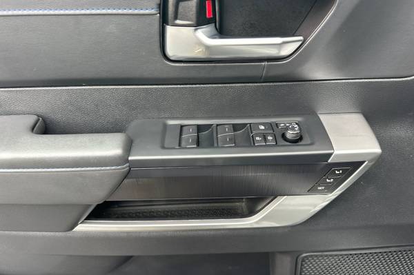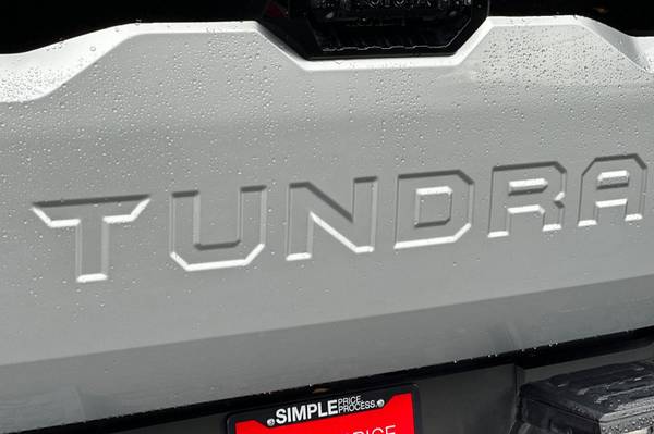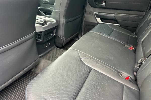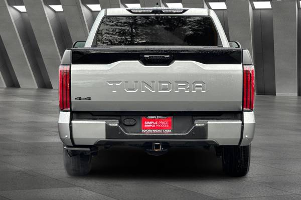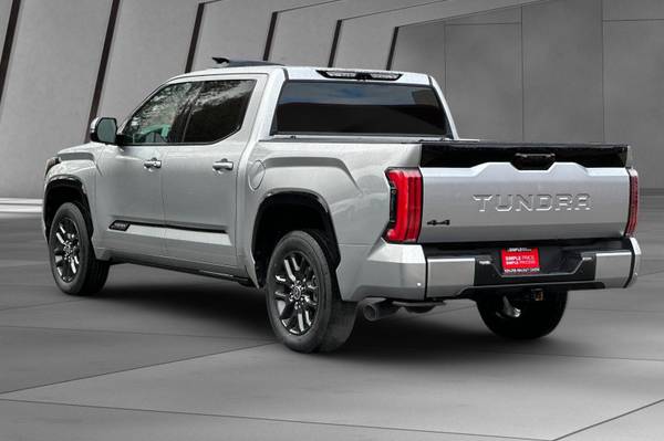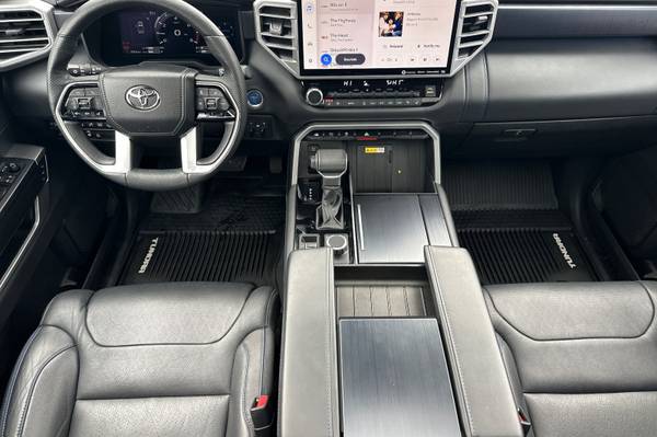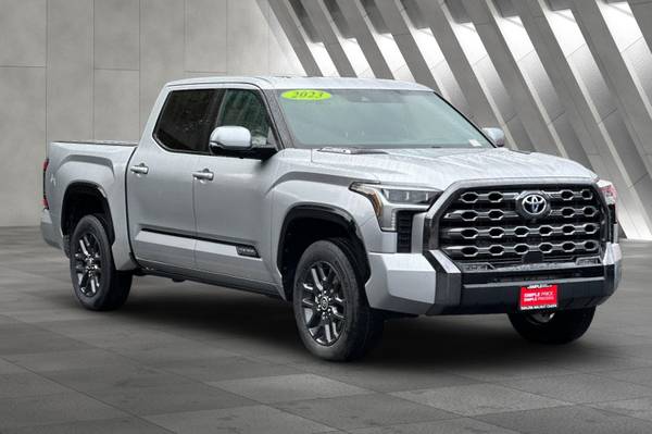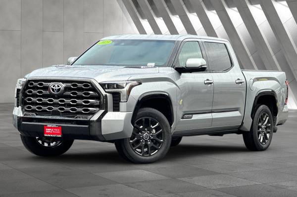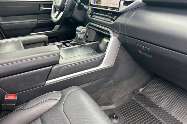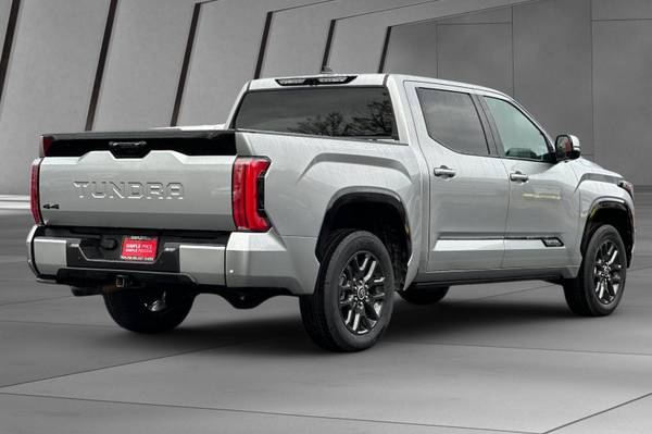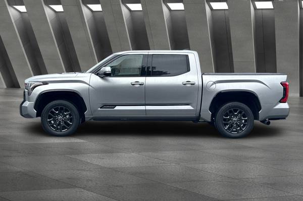 MECHANICAL & PERFORMANCE i-FORCE MAX Twin-Turbo V6 Hybrid, DOHC 24V with Dual VVT-i and Electric Motor/Generator, 437 hp/583 lb-ft 10-Spd Auto Trans with Sequential Shift Drive Mode Select with TOW/HAUL Modes 4WDemand Part-Time 4WD w/Elec Controlled Transfer Case and Auto Limited Slip Diff Multi-Link Rear Suspension Tow Rcvr Hitch w/Integ 4/7-Pin Connector SAFETY & CONVENIENCE Toyota Safety Sense 2.5: Pre-Collision Sys w/Pedestrian Detection, Full-Speed Range Dynamic Radar Cruise Control, Lane Departure Alert w/Steering Assist, Lane Tracing Assist, Automatic High Beams, Road Sign Assist Trailer Brake Cont & Trailer Sway Cont Blind Spot Monitor w/RCTA Trailer Backup Guide w/Straight Path Connected Services Capable. 4G network dependent. See Toyota.com for details. EXTERIOR 20-in. Dark-Painted Alloy Wheels Aluminum-Reinforced Composite Bed with 120V/400W AC Power Outlet and LED Lights Auto-Leveling LED Headlights w/LED DRLs INTERIOR 14-in. Toyota Audio Multimedia w/ Apple CarPlay and Android Auto Compatibility SiriusXM w/3-Month Platinum Plan Trial JBL 12-speaker w/subwoofer & amplifier 12.3-in. Digital Meter Leather-Trimmed Power-Adjustable Driver/FR-Pass Seat w/Power Lumbar Heated and Ventilated Front & Rear Seats Power Tilt/Slide Panoramic Roof, Tundra Hybrid Platinum, 4D Crew Cab, 3.4L V6, 10-Speed Automatic, 4WD, Celestial Silver Metallic.