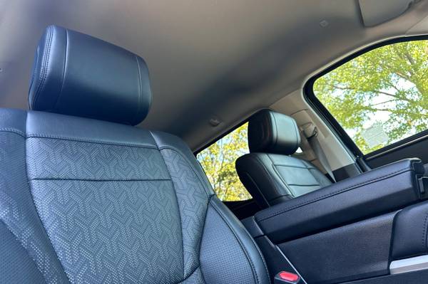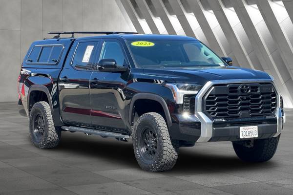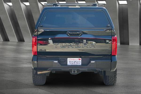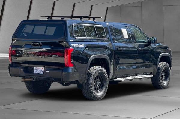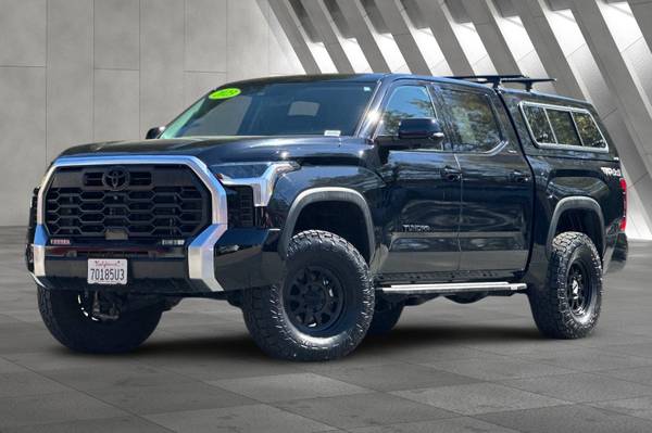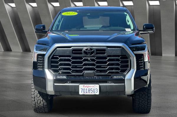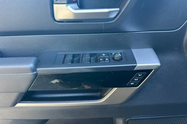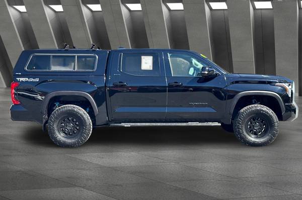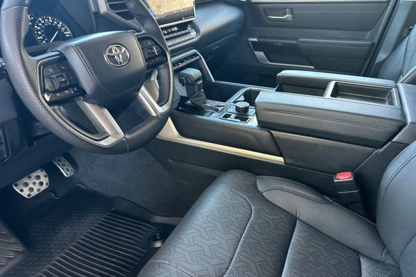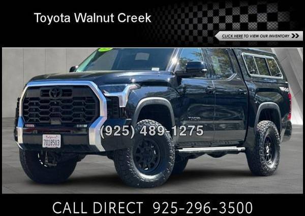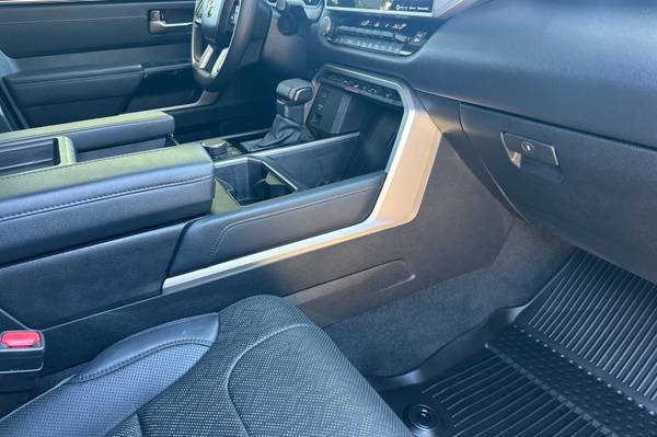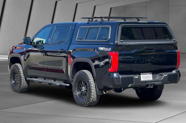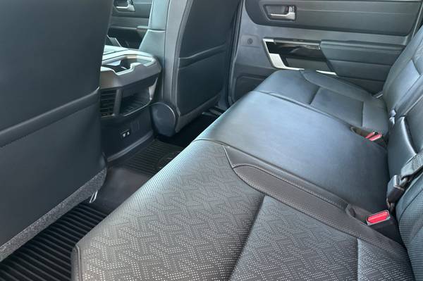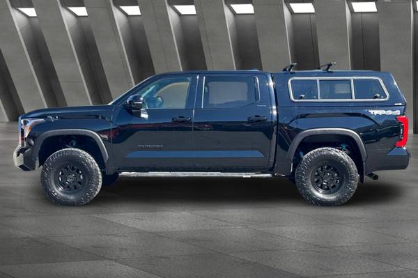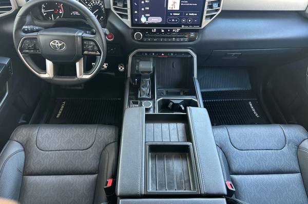 Accessories F FE 50 State Emissions F MO PVM BSM Outer Mirrors (color-keyed) F OF TRD Off-Road Package - Includes 20-inch TRD alloy wheels with all-terrain tires, TRD grille, "TRD OFF-ROAD" bed-side decal, off-road suspension with Bilstein shocks, skid plates, mud guards, red TRD engine start button, TRD leather shift knob, aluminum sport pedals, electronically controlled locking rear differential, Multi-Terrain Select (MTS), Crawl Control (CRAWL) and Downhill Assist Control (DAC) F SO Off-Road Front Skid Plate P 2T All Weather Floor Liners MECHANICAL & PERFORMANCE i-FORCE Twin-Turbo V6, DOHC 24V with Dual VVT-i, 389 hp/479 lb-ft 10-Spd Auto Trans with Sequential Shift Drive Mode Select with TOW/HAUL Modes 4WDemand Part-Time 4WD w/Elec Controlled Transfer Case and Auto Limited Slip Diff Multi-Link Rear Suspension Tow Rcvr Hitch w/Integ 4/7-Pin Connector SAFETY & CONVENIENCE Toyota Safety Sense 2.5: Pre-Collision Sys w/Pedestrian Detection, Full-Speed Range Dynamic Radar Cruise Control, Lane Departure Alert w/Steering Assist, Lane Tracing Assist, Automatic High Beams, Road Sign Assist Trailer Brake Cont & Trailer Sway Cont Blind Spot Monitor w/RCTA Connected Services Capable. 4G network dependent. See Toyota.com for details. EXTERIOR 20-in. Alloy Wheels Aluminum-Reinforced Composite Bed LED Headlights with DRLs and Manual Leveling Adjustment INTERIOR 14-in. Toyota Audio Multimedia w/ 9-Speakers, Wireless Apple CarPlay and Android Auto Compatibility SiriusXM w/3-Month Platinum Plan Trial Dual Zone Automatic Climate Control Smart Key System with Push Button Start SofTex-Trimmed 8-Way Power-Adjustable Driver/FR-Pass Seat w/2-way Power Lumbar Heated and Ventilated Front Seats 60/40 Split, Fold-Up Rear Seats with Under-Seat Storage Compartment Power Vertical Rear Window, Tundra Limited, 4D CrewMax, 3.4L V6, 10-Speed Automatic, 4WD, Midnight Black, Black w/Leather Seat Trim.