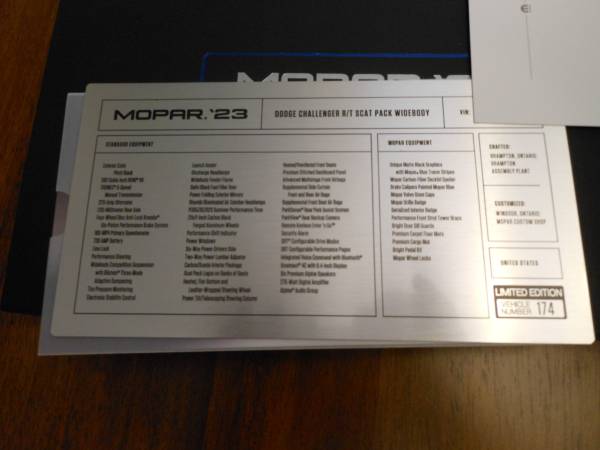 2023 DODGE CHALLENGER- MOPAR 23- LAST CALL SPECIAL EDITION. #174 of only 220 ever made. Rare and collectible. 1200 miles. Original owner. Adult owned. Always garaged and covered. Never driven in the rain. Showroom condition. 6.4 Hemi engine. 6 speed manual transmission. Wide body. Factory carbon fiber spoiler and factory strut brace. The Mopar 23s were the last Challengers to be made and just 220 made with 20 of them going to Canada making them very sought after. Mopar lover`s don`t miss out.