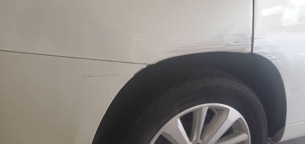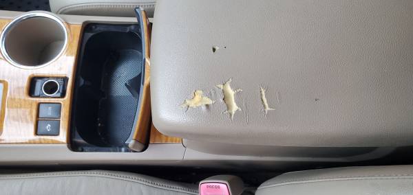 She has a scratch on the passenger side rear quarter panel and bumper,, and some pitting in the center console armrest. The dvd player has stopped working, but otherwise she's mechanically sound.