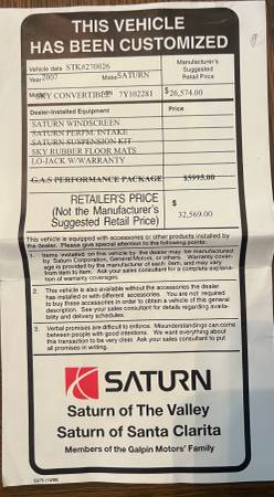 I am selling a very nice 2007 Saturn Sky convertible. It has an upgraded option package and also has brand new tires along with a recent full service. The top is in great condition with no rips or tears.It has been upgraded with a Kenwood Xcelon radio with CarPlay which cost $1000.00. It looks and sounds great. It also has super low mileage with only 28,669 gentle highway miles on it. It is a 2.4 L dual overhead cam VVT engine with an automatic transmission. Bilstein monotube shocks. Stainless steel exhaust. It has great heat and air conditioning that blows, hot and cold. And has a premium trim package with leather seat inserts, leather wrapped steering wheel And metallic finish steel plates. It also has stainless steel pedal covers. The monsoon premium audio speakers sound amazing. It also has limited slip differential. Below are the Custom upgrades that were performed when the vehicle was purchased from the dealership. The upgrades cost $5995.00. You can see the original window sticker and customization form in the photos. In addition to that it had a brand new catalytic converter installed earlier this year. That was $1200.00. This car is in great condition and is a great driver. With the upgrades it sounds like a little race car. Nice throaty exhaust as well. G.A.S Engine Power Enhancements
