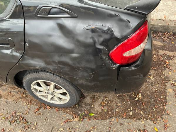 The body has cosmetic damage from a prior hit-and-run. Interior condition is fair. The rear left door does not open from the outside due to the body damage. Tires are in good condition.
