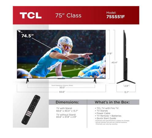 TCL 75-Inch Class UHD 4K LED Smart TV with Fire TV (75S551F, 2024 Model), Dolby Vision, HDR PRO+, Dolby Atmos, Alexa Built-in with Voice Remote, Apple AirPlay 2 Compatibility, Streaming Television