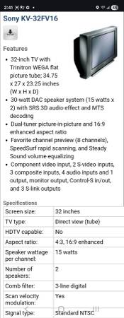 Sony trinitron model KV-32FV16 working (see pictures) best offer gets it (no low balling) you pick up.