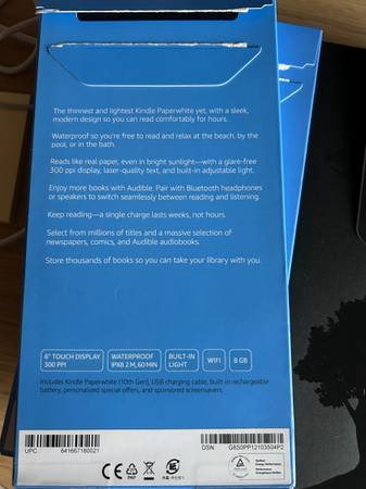Brand New: Kindle Paperwhite Black 6" touch display wifi 8gb Un-opened and in the box still. Water proof IPX8 2M, 60M Built-in adjustable Light Wifi 8gb Glarefree 300ppi display, laser quality text...