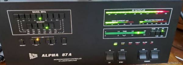 Alpha 87A, linear amplifier, 1.5 kW, auto-tune, CW, SSB, digital modes, 240V, HF, amateur radio, microprocessor-controlled, full power, clean output, ham radio gear, vintage amplifier, reliable