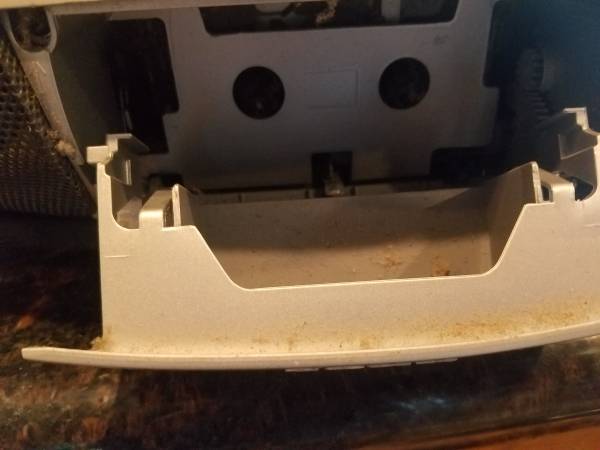 Needs front button reinstalled. No power cord,remote,antenna and batery cover. Can't test it - so sold for parts $25/ bo