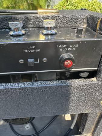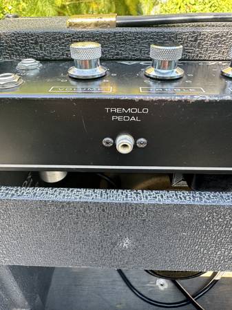 The control panel featured two instrument inputs plus volume, treble, bass, tremolo speed and tremolo depth. The lower control panel included a foot switch jack and a line reverse switch.