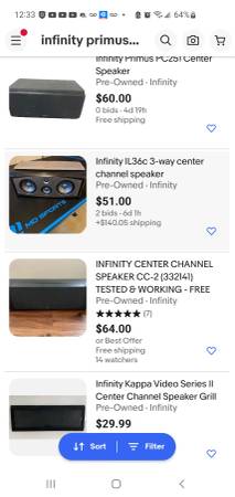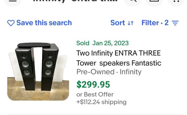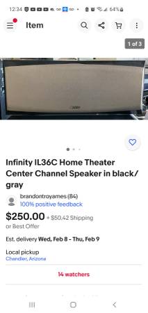 Infinity Entra three tower speakers. Excellent reviews. Sell on eBay for $450. Infinity IL36c top of the line infinity center channel speaker. Last one sold for over $300. Both (3 speakers)in excellent condition. Quality stuff made to last. So recent market value is $750 with tax. Numbers pulled straight from auctions. $500 is your steal price today. Price drop to $350.