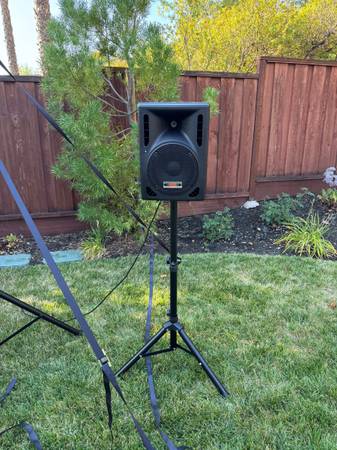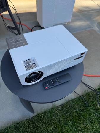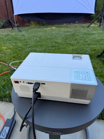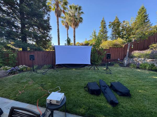 Complete outdoor theater system. Great for outdoor parties and sleep overs. - Two high grade speakers with stands - Screen with stands - Projector - All cords and extension cords