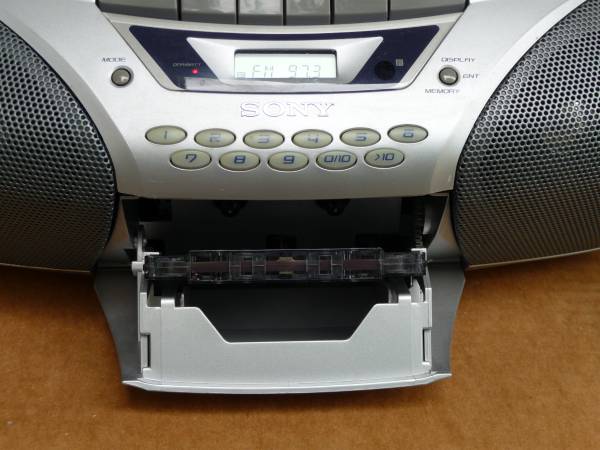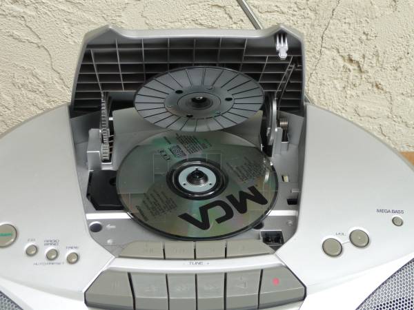 AM/FM stereo tuner, CD Player, Cassette Tape Player/Recorder with Mega Bass sound system, and a stereo headphone mini jack. Operates on AC power (battery power optional).
