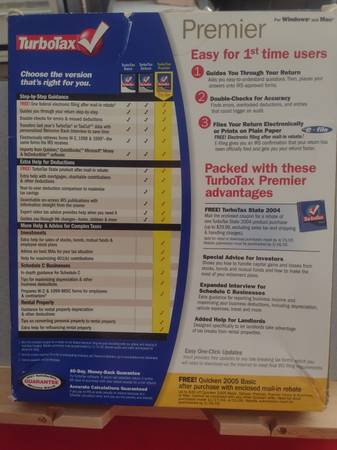TurboTax makes filing your taxes less painful. 2004 Premier and State CDs include all features in TurboTax Deluxe for W-2 wage income. Adds help for investments, Schedule C businesses and rental property income. Maximizes your personal and small business deductions.