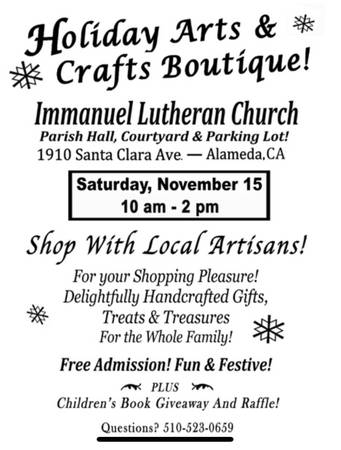 Annual Holiday Arts and Crafts Boutique hosted by Immanuel Lutheran Church. Fun! Festive! And Free admission! More than two dozen local artisans offer an amazing variety of fine handcrafted gifts, jewelry, wood and fabric arts, food, treats and lots more!! Mrs. Santa Claus will be there for a photo op and children’s free book giveaway! (Courtesy of East Bay Children’s Book Project). The fun includes live music and a raffle! This event is a fundraiser to help support community outreach church sponsored activities, including the monthly Dine and Connect dinner for the food-challenged in Alameda. Event is held in the Parish hall, Parking lot, and Courtyard. Corner of Santa Clara Avenue and Chestnut Street. Please enter on Chestnut St. Hope to see you there! Artisans and crafters interested in joining us please leave a message at show contact info