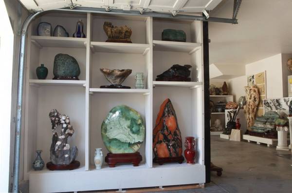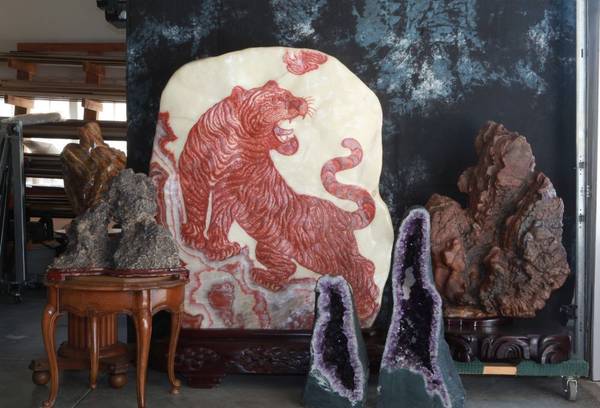 Hand oil printing on canvas, Chinese ink printing, Suiseki viewing stone, Stone bonsai art work, Scholar and ornamental stone, Basilan amethyst geode quartzand, Dinosaur egg, and beautiful cloisonne vase.