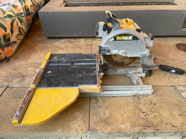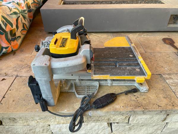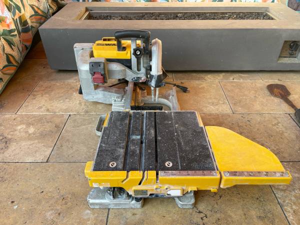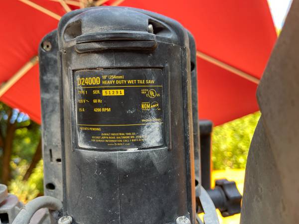 Selling my DeWalt D24000 tile saw with 10” diamond blade. It powers on and cuts, but runs loud—likely needs new bearings. This listing is for the saw only; no basin, pump, or stand included.