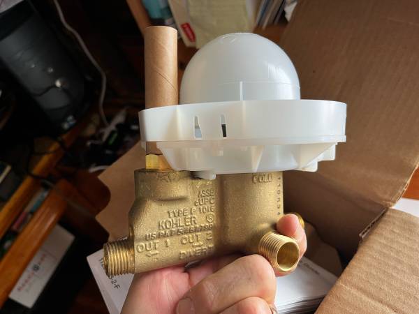 As pictured, new in box Koehler “Rite-Temp” pressure-balancing valve with diverter. $206 plus tax on line just for the valve. Also trim, handle, and shower head.