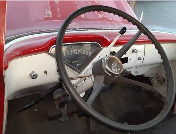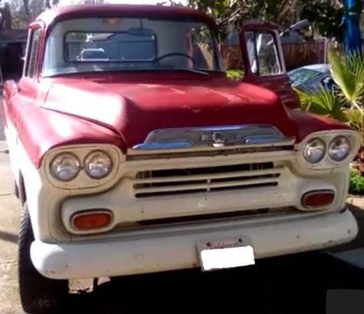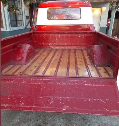 1959 Chevrolet Apache Fleetside with beautiful wooden bed. Three-on-the-tree column shift manual clutch and 4X4 4 wheel drive. Registered with current tags and running engine