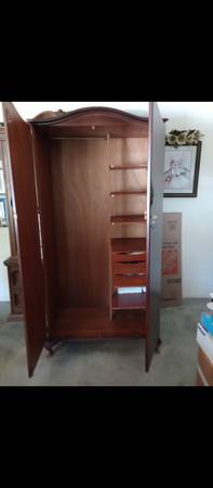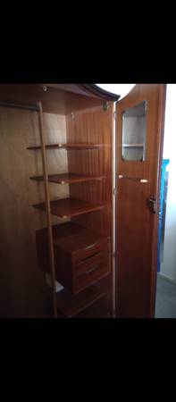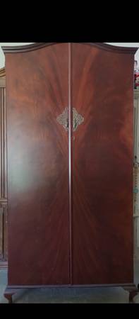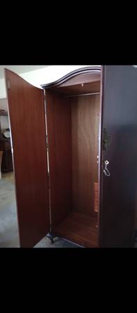 Beautiful antique Armoire with original key and lock, shelves , drawers, mirror. 72" tall 21 1/2" deep 36 " wide EXCELLENT SHAPE! Must see!