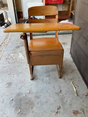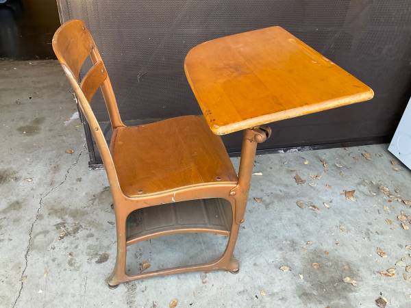 Thank for viewing this authentic old school desk made in the USA (Grand Rapids, MI) by Envoy. The seat, with space to store your schoolbooks underneath, is attached to the desk so it's all one piece (and not very heavy). Use it as a desk or attractive and unique display piece.