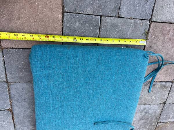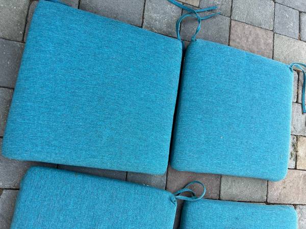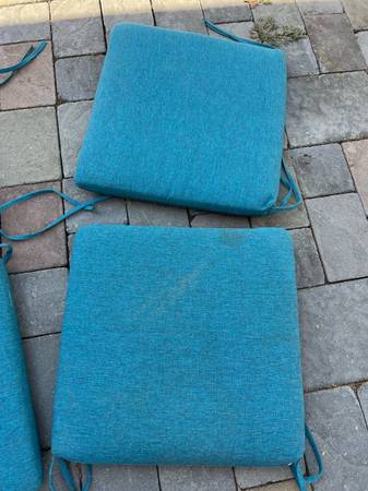 4 Piece Outdoor Patio Furniture Cushions in Teal Blue Located in concord Very good condition No damages Covers not removable Measures 18” x 18” $40 for all 4 pieces or best offer