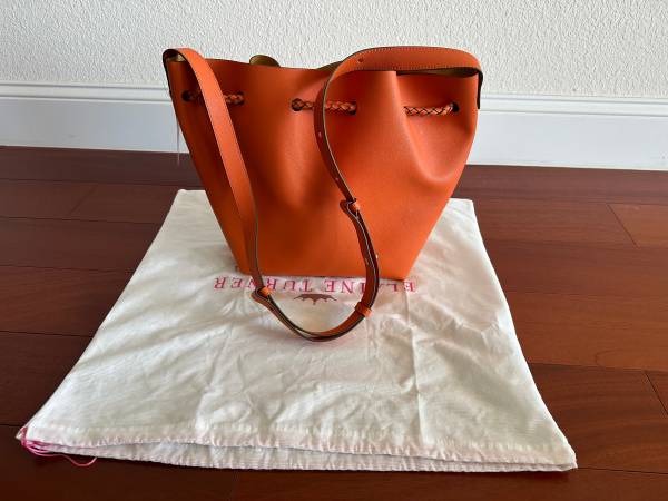 Perfect bag for a sunny day. Bright Orange color exterior. Antique Gold color interior. Adjustable 1” wide strap allowing bag to be worn over shoulder, handheld or as a crossbody (drop ranges from 10” to 20.5”). Color Gold metal grommet with embossed crown. Braided 1/2” diameter drawstring style closure at top. Elaine Turner logo and crown embossed in color Gold at top. Bag in unlined with clean finish on inside. All raw edges clean and painted.
