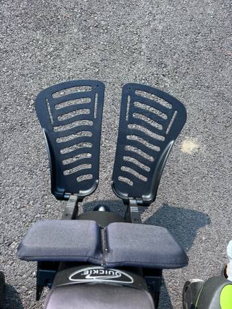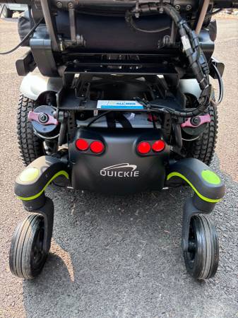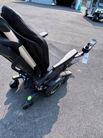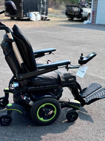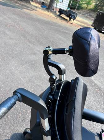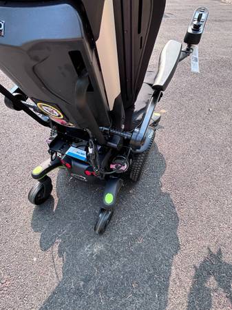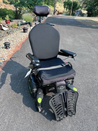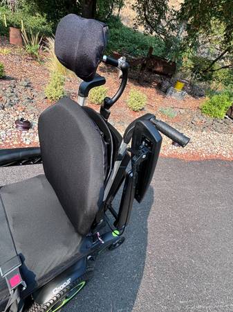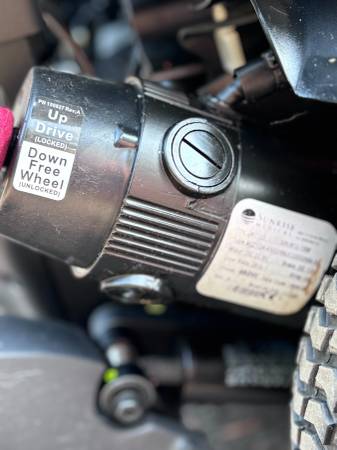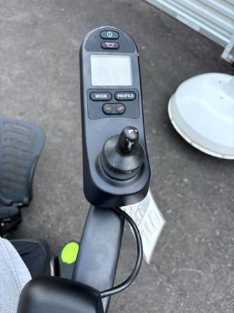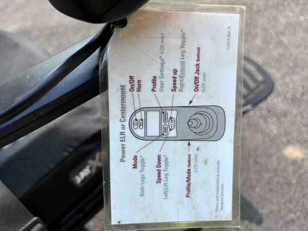 Like new. Batteries are in great condition. Horn, lights, controls all work. Hydraulic tilt and adjustable hydraulic feet rest. Digital display on controller. Weighs a little over 300 pounds. Has a seat belt. It's adjustable in many ways. The seat is about 20" wide and 18" deep. The backrest is about 20" wide and 32" tall to the top of the headrest. Adjustable. The front wheelbase is about 25" wide.