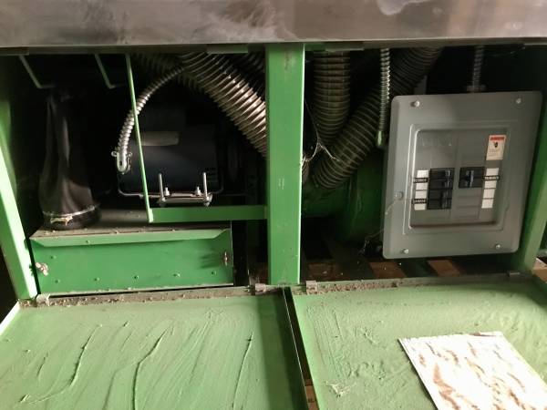 This main console is a well maintained unit with original paint and finish. The main shaft motor is wired for 220V and has 2 quick change 60"sanding belts. One 4" W , one 1 9/16" W, and a center sanding drum 4"W x 3 1/4". The right bayonet fitting has a "B" sanding wheel (shown) or a wire brush or stitch picker can be mounted (both included). The left side of this shaft has a heel breaster mounted. The heel trimmer, sole trimmer and sharpening unit are all wired to a separate 110V motor. The Naumkeag is also a 110V unit with its own on / off switch. A powerful dust collection system is built in to service the entire unit, which has been emptied cleaned and ready for service. The machine width is 59" and weighs approximately 750 lbs.