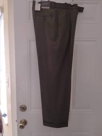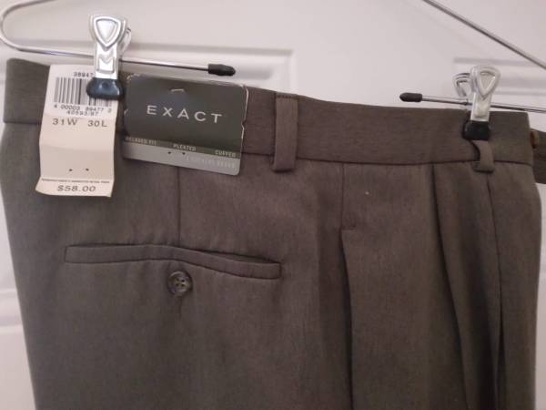 Brand New with tags Exact by Dockers Mens Dress Pants size 31 waist x 30 length color is Olive Green / Grey. Pants are pleated in front and are cuffed. $15