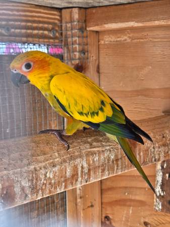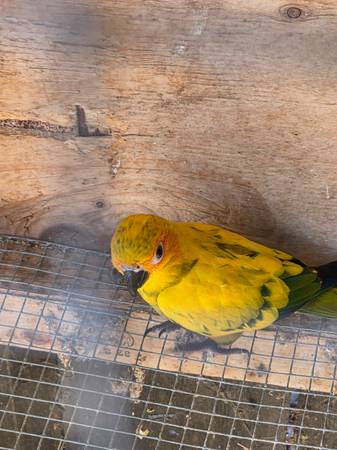 Young sun conure almost 5 months old. Parents raised. Not tamed. DNA tested male. Re-homing fee applies. Message me for more info.