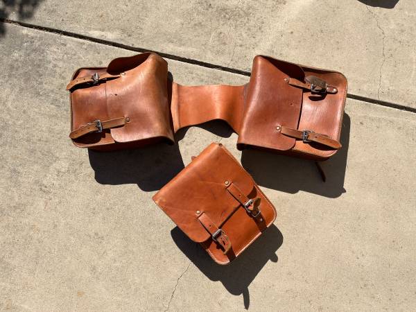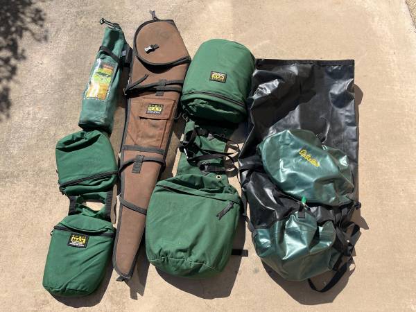 Gun scabbards , Saddle Bags , The leather set was custom made by Montana saddlery for a Rokon Trail Breaker , The green set is for a Horse set up there is a water proof bag for a sleeping bag or whatever and a packable table Trailmax scabbard.