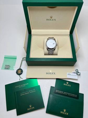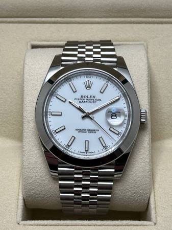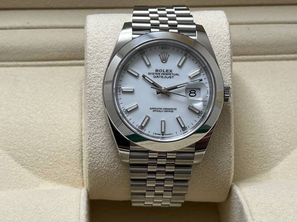 For sale is an UNUSED Full Complete Set of a 41mm Rolex Oyster DateJust 126300 Smooth Bezel White Stick Dial in Jubilee Bracelet.