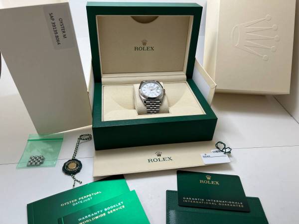 White Cardboard Box, Outer and Inner Box, Green, white and sticker price tags, new style green leatherette pass case with (dated) 2022 credit card style warranty card, and 2 booklets. AD sized jubilee bracelet with 3 spare links. UNUSED