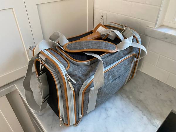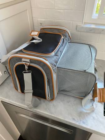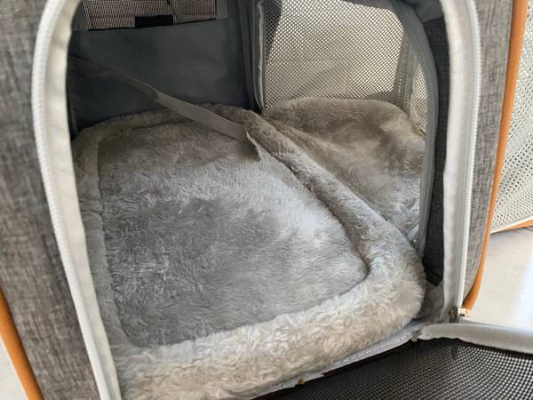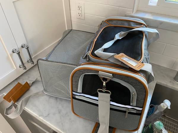 This travel kennel is in near perfect condition, purchased around 2 months ago. Its a TSA airline approved pet carrier for cats and small dogs. We used once to fly our new puppy out from Montana, and its been unused since. It is very sturdy, small, comfortable, clean, and has a small expansion area for pet when needed (ie, airport). Soft plush padding inside, and the expandable area can be closed up on the inside to streamline the size. These retail online for $90.