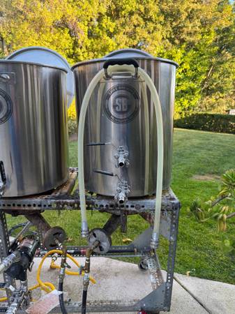 A complete home brew Spike Brewing system including 15 g HLT, brew kettle and mash tun. This system is powered by two propane burners and includes two pumps. The system uses Spike Brewing’s HERMS system that can provide a high level of control over the mash temperature for all grain brewing. I have had the system for about ten years and it works great with very high efficiency mashing (consistently 85% + conversion). It is designed for use with a single propane tank but I converted to one tank per burner for better temperature controls. This system has quick connects for all of the hoses and pumps and makes brewing a 10 gallon batch very easy and fun.