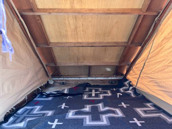 Upper pop top fits and stores a full size 3 - 4” thick mattress with bedding. Current tent is made of 6oz canvas and has one external rollup door with zippers.