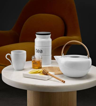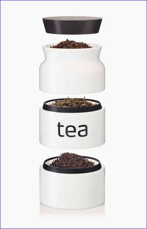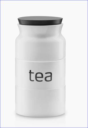 White porcelain tea caddy with a silicone lid and three separate compartments for storing loose leaf tea or tea bags.