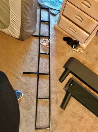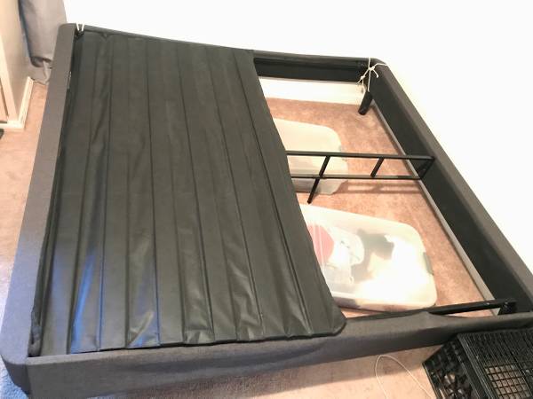 Free king bed frame parts. Wood slats, hardware, top and foot panels are in good shape. The side panels need fixing/ redrilling due to bolts breaking out. Perfect for the fixer upper or just for the...
