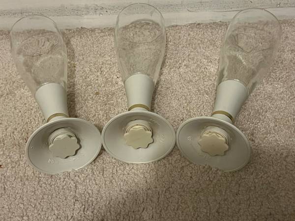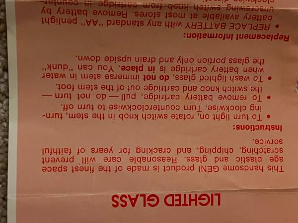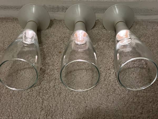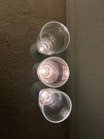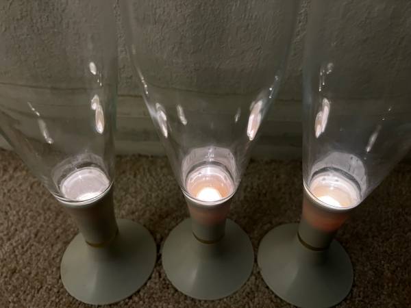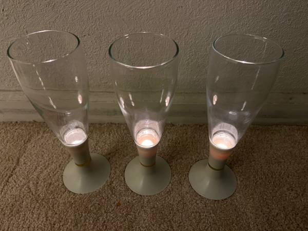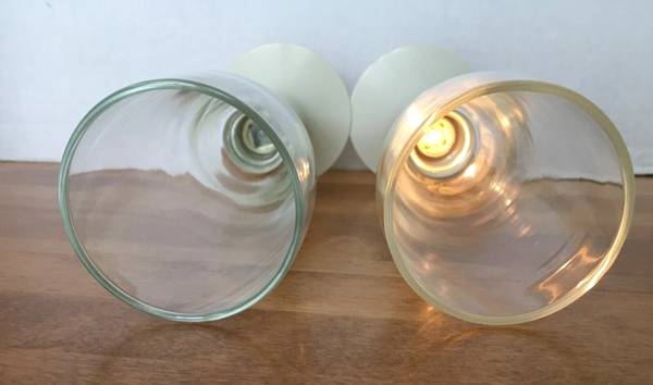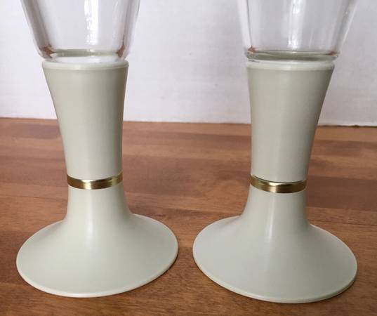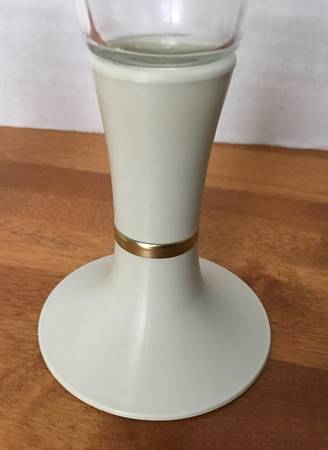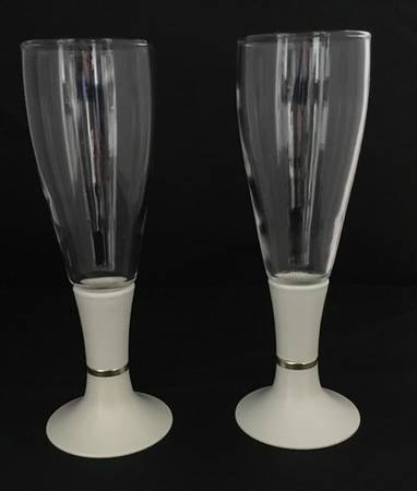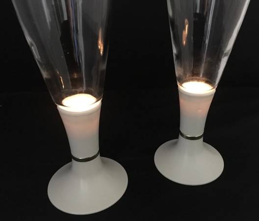 Vintage Lighted beer, wine, or Champagne glasses. They use 1 AA Battery. Works great. These are an off white plastic base with a gold ring, and the glass is in perfect shape. Each measure 9” tall.