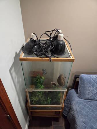 I have a terrarium used for my son's gecko. Measurements" 18"x18"x36" Screen that slides open in front. Has hear lamps, thermometers and other stuff. Some accessories are not even opened yet....