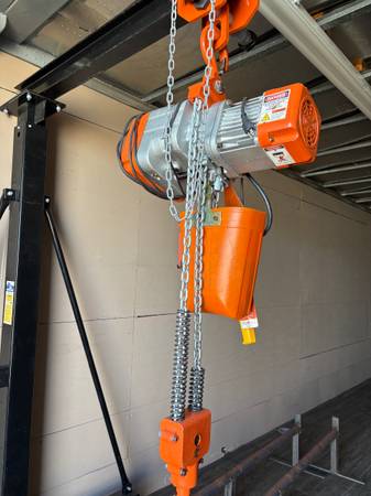 I’m selling a set of a crane and electric hoist in like new condition they were used for only one job. They come with two different sets of casters so you can use the one that accommodate to your needs it comes with about 50 feet of tracking rails. See pictures for details. This set together cost around 3k I’m asking for $1200 obo Very easy to take apart for transportation. Dimensions. 98” H. 86” W. 59”D. Please call or text if you’re interested. 510-323-58 one zero. Thank you