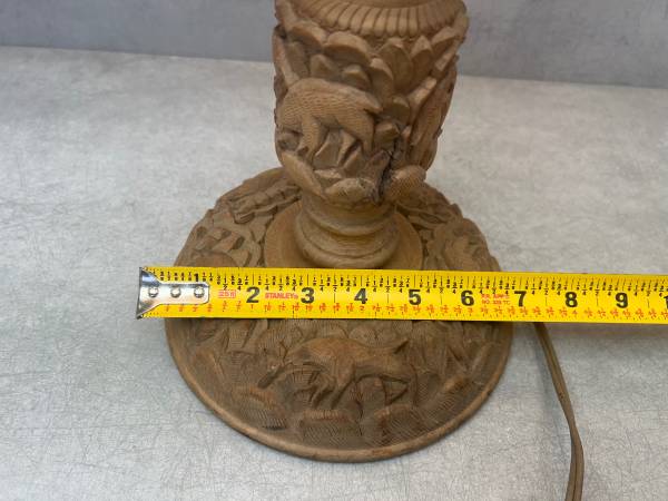 Two hand carved vintage tiki table lamps. Small rubies or garnets, or red glass set for the eyes in all the animals. Matching shades. Great decor for your tropical needs. $100. pair OBO