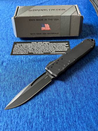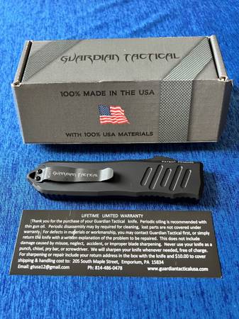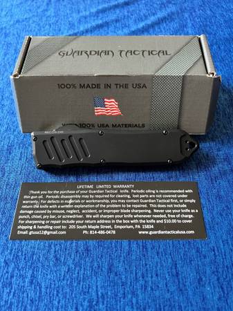 Guardian (GT) Recon-040. It is brand new in box, total and absolute mint condition. Never used, cut, carried or even fidgeted with. Lifetime warranty (including free sharpening) through GT. 100% USA made. Specs: Black cerakoted 6061-T6 milled aluminum body with black DLC (Diamond Like Carbon) Elmax ultra premium stainless steel hollow ground blade. Black type-3 anodized activation switch, hardware and pocket clip. Bottom of handle exhibits a tungsten carbide glass breaker. Pocket clip is reversible. Blade length is 4.125-inch. Handle length is 5.625-inch. Overall length is 9.750-inch. Weight is 6-oz. GT can verify authenticity via its laser engraved serial number (#0477). The activation switch rides on a stainless steel plate with 3 ceramic ball bearings which provides an extremely smooth action while eliminating wear and tear. GT’s innovative locking mechanism is placed off center from the blade channel to avoid drag against blade when operating the action. Can meet buyers in Livermore, San Ramon, Dublin, Danville, Alamo, Pleasanton or Walnut Creek. Free shipping offered for out of area buyers. Feel free to contact me with any questions via Craigslist messaging system, email, phone call or text. If this posting is still up, it’s still available. Thank you for your consideration.