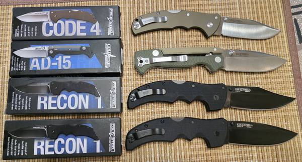 I have both models in stock, new in box, cash only. CPM super steel is made in USA by Crucible, this is a hard use every day carry knife at bargain price - $100 for Code 4, $125 for Recon 1 (Also pictured is AD-15, $160)